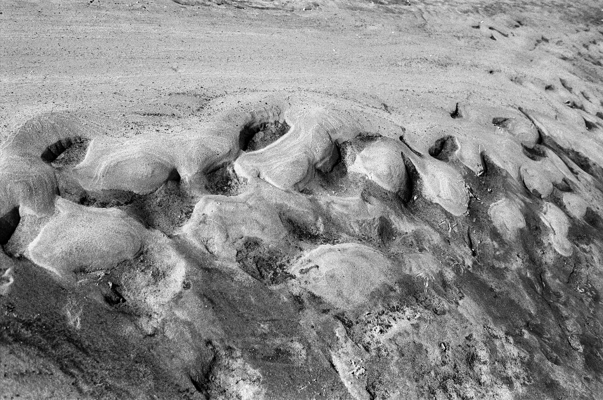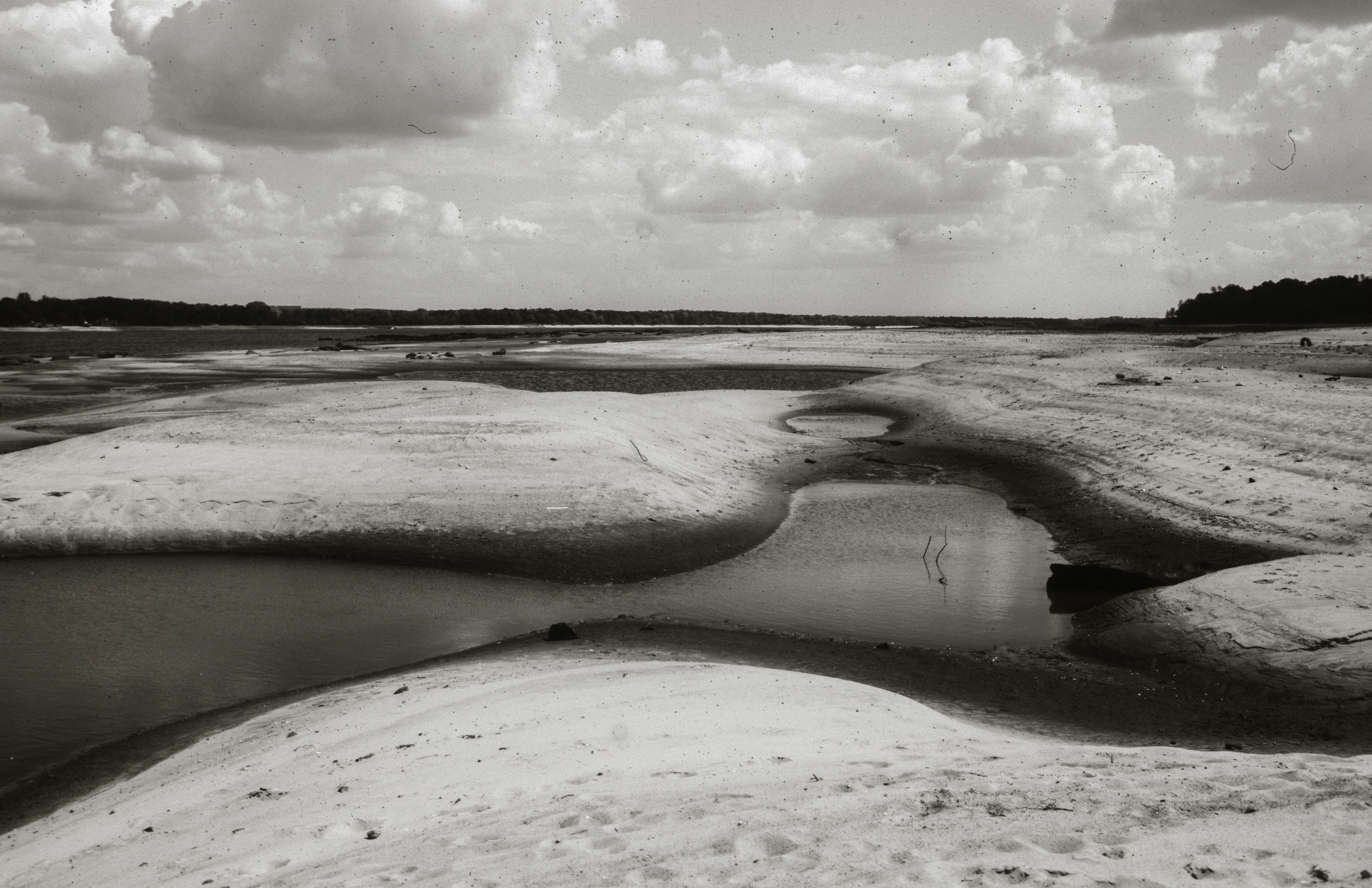 The dried up bank of the Dnipro looks exposed as if ashamed to show its body. It is scattered with stones and shells (like moles) and remnants of water lilies. The algae which I used to fear getting tangled in when swimming into the depths as a child have completely disappeared, dried up in the sun. Just like back then you can only step on water chestnuts in the sand but now they resemble a to tank hedgehogs.